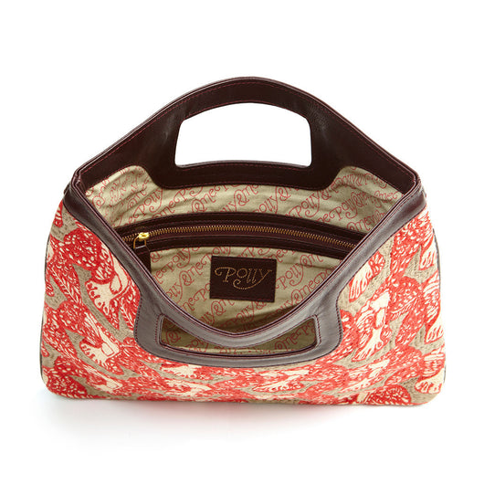 This playful and stylish clutch features a cotton front that has been hand-embroidered with a graphic water-buffalo pattern in shades of red, cream and brown. The back and top handle are brown leather.